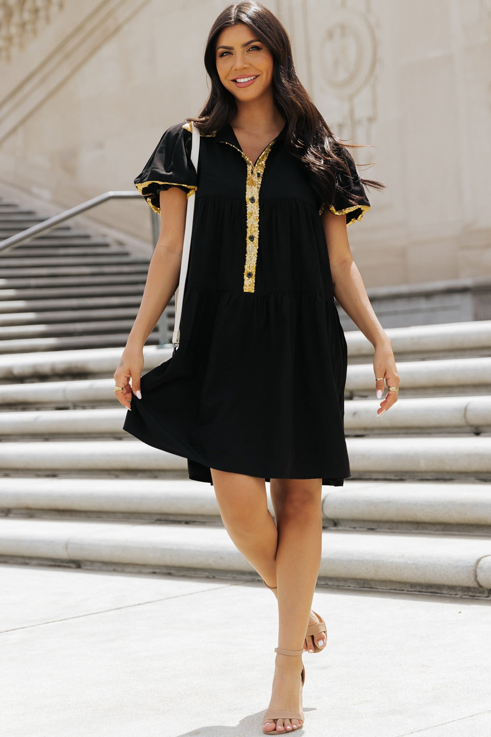 Sequin Half Button Short Sleeve Dress